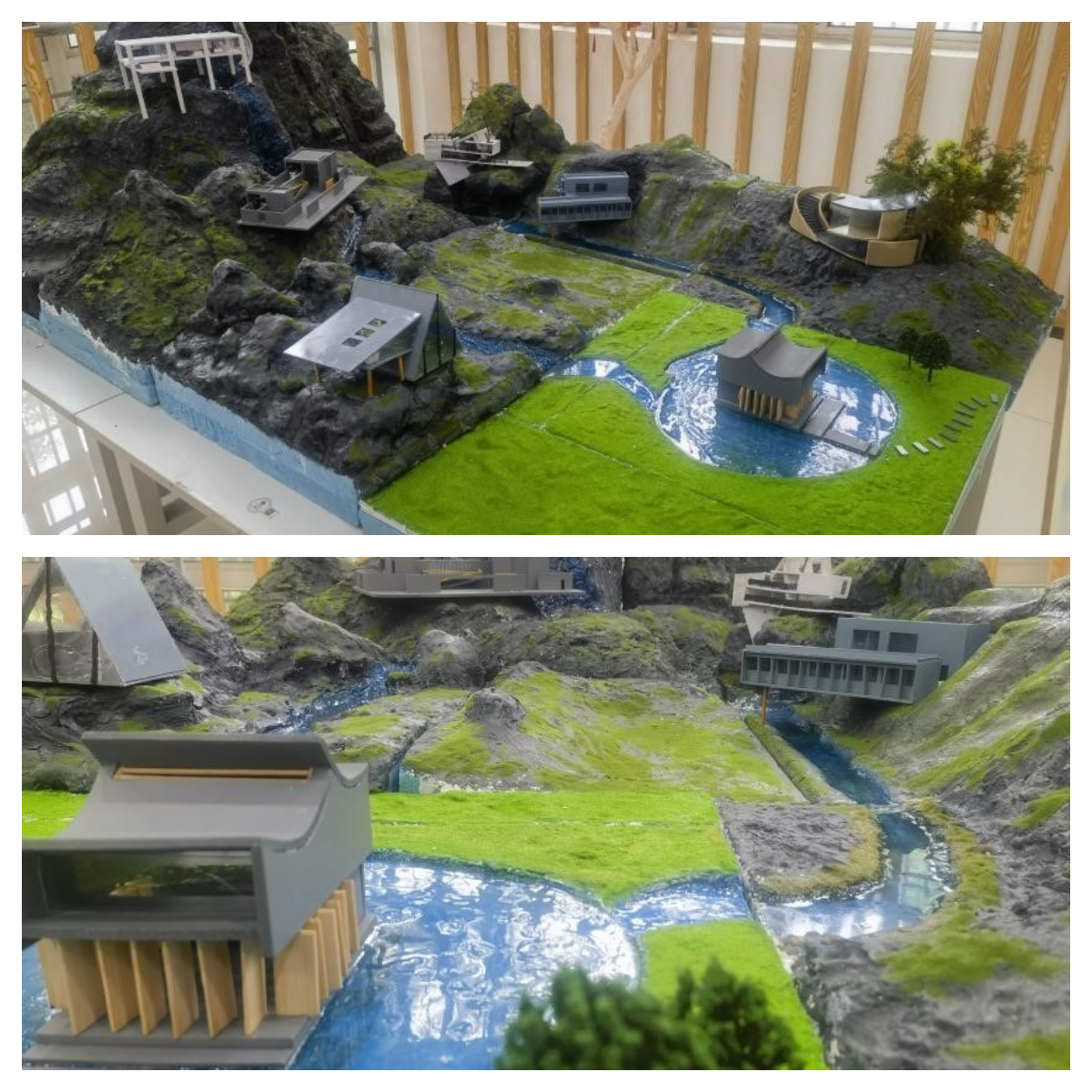 在设计和制作的过程中要求对于环境的整体规划有一定把握、将景观四大要素尽力自然结合。以项目为教学导向,将全班分为8个大项目组,制作内容囊括以山体地形、水体流向的自然环境制作,以及以建筑为主景的人工环境制作。每组工作内容充实,分工明确,节奏紧凑。学生们在设计过程中充分利用锯子、凿、斧、刨、尺子、砂纸等等现有工具,在经过选材、取料、绘线、切割、刨削、打磨、磨砂等工序后,完成了完整的模型作品。各种精美奇特的模型设计体现了学生们独特的创意思维和扎实的设计功底。
