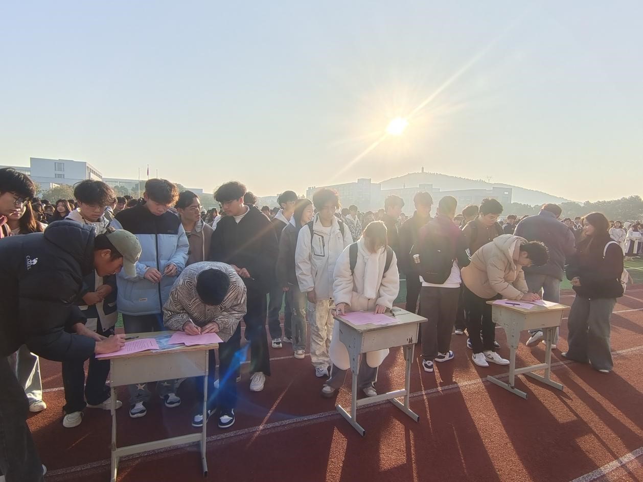 各班代表在主席台下进行《久久久少妇电动车校园安全骑行倡议书》签订活动。