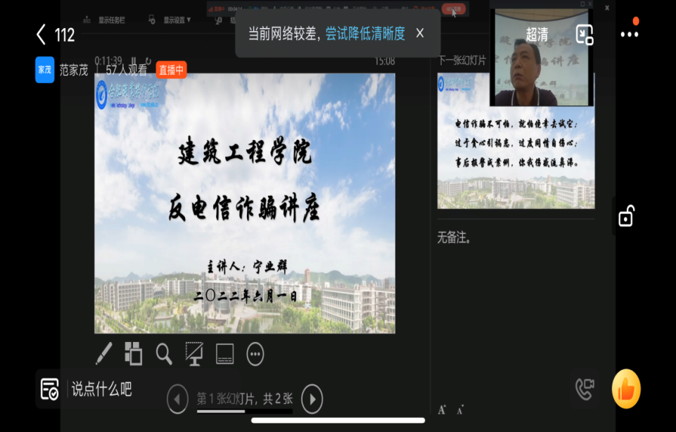 6月1日下午,学院党总支书记宁业群在鼓山校区图书馆二楼报告厅以钉钉直播和线上、线下相结合的方式面向全院师生上了一堂生动的“反电信诈骗”专题宣传教育课。