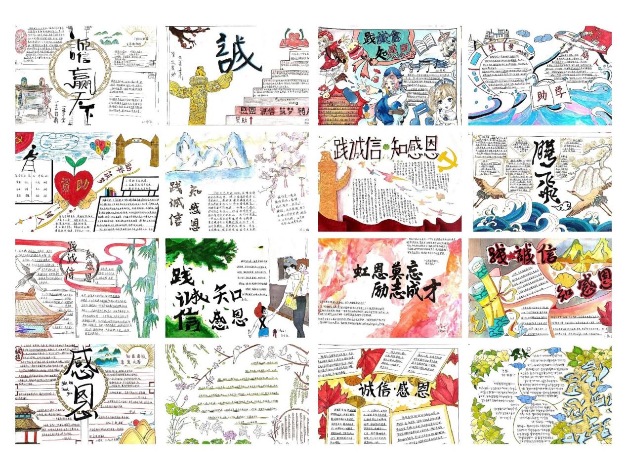 活动分为两部分内容,活动一以“践诚信 知感恩”为主题征集资助宣传手抄报,通过前期的宣传和准备,我院在校班级积极参与,共收到90余幅作品。