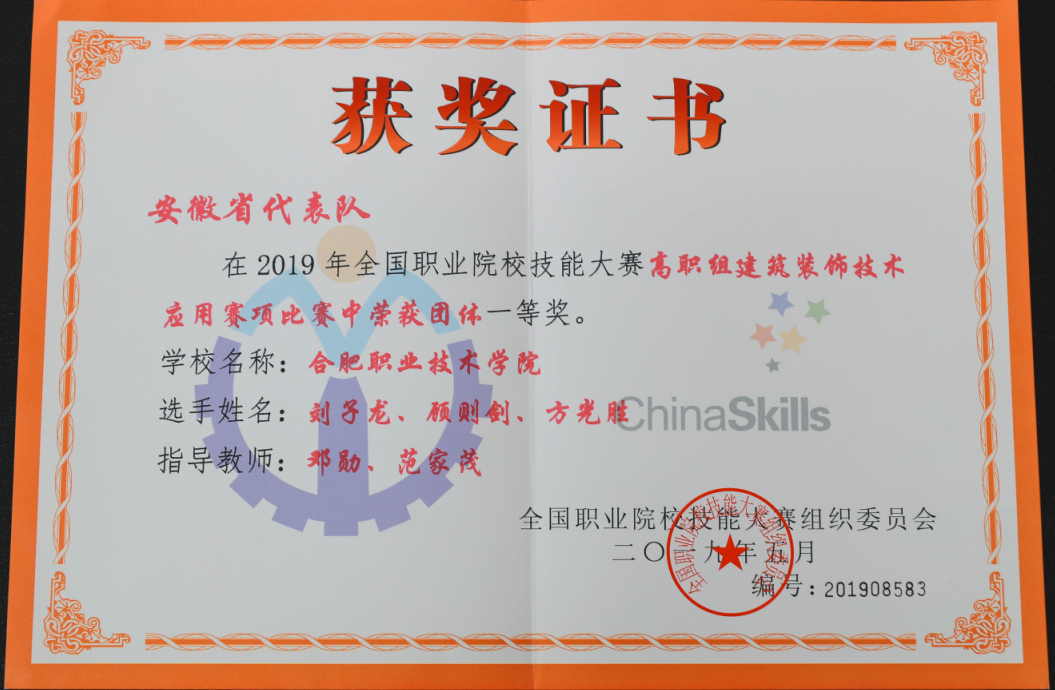 2019年全国职业院校技能大赛高职组建筑装饰技术应用赛项于6月1日在浙江建设职业技术学院举行。本次大赛吸引了来自全国31个省、市、自治区以及新疆生产建设兵团的共79支高职院校代表队参加。我院17级学生方光胜、顾则剑、刘子龙三位同学经过省赛选拔,脱颖而出,组成合肥职业技术学院代表队参加本次大赛。