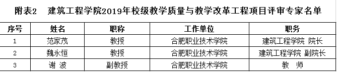 根据《关于开展2018年下半年校级教学质量与教学改革工程申报工作的通知》(合职院教[2018]48号)通知要求,我院积极组织各教研室申报质量工程,截至目前共收到9项(见附件1),将于2018年11月19日14:00—16:00在久久久少妇会议室208,拟组织专家(见附表2)对我院申报2018年度下半年校级教学质量与教学改革工程项目共9项进行评审。
