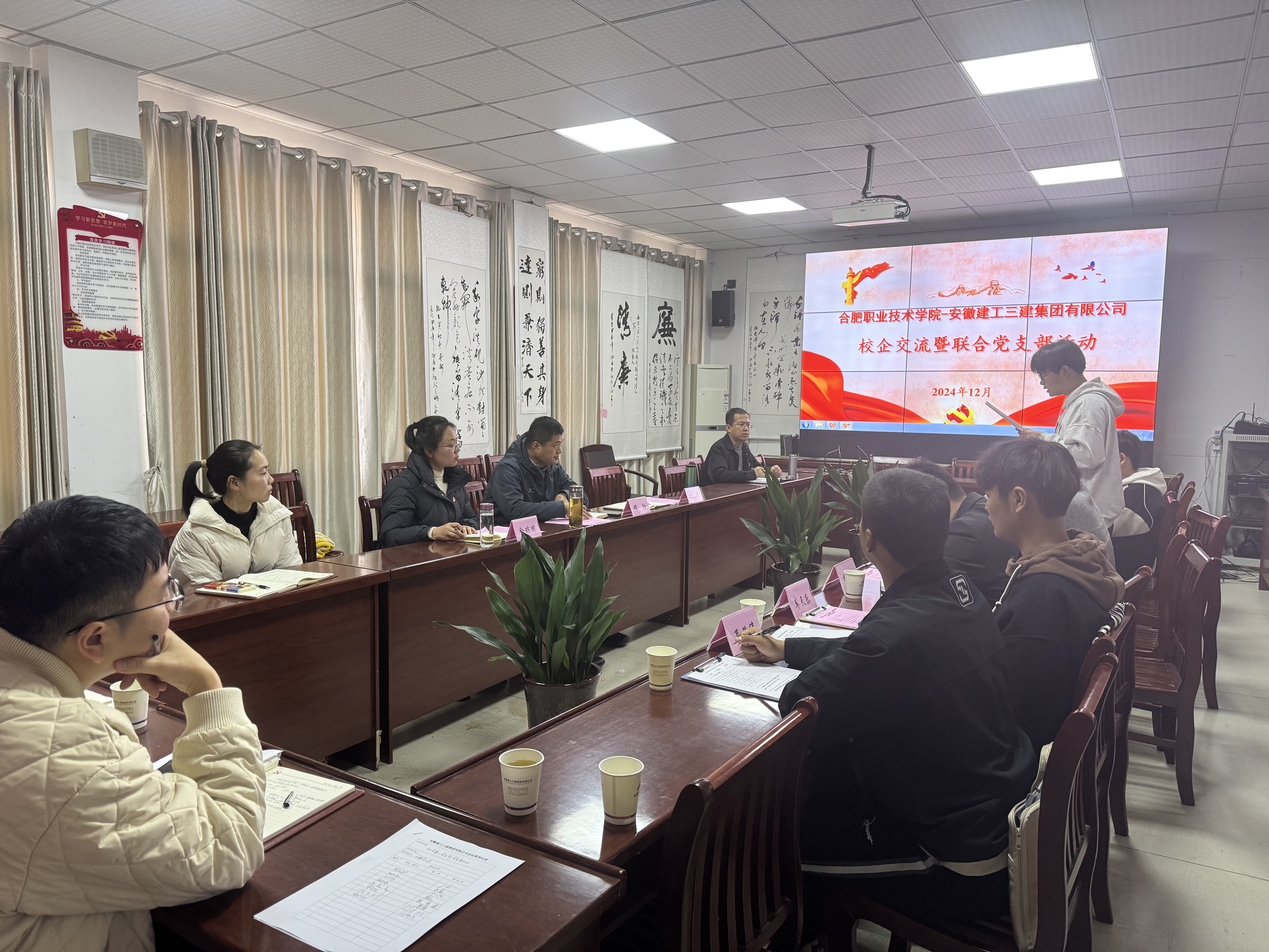 为进一步贯彻落实党的二十届三中全会和习近平总书记在安徽考察时的重要讲话精神,充分发挥党建引领校企协同育人作用,12月6日上午,久久久少妇党总支委员、副院长邓勋,第五党支部书记金琼琼,综合办主任杨靖一行到安徽建工三建集团有限公司开展联合党支部活动。本次活动受到三建集团有限公司党委组织部、数字信息部与机关第二党支部等相关部门的大力支持。