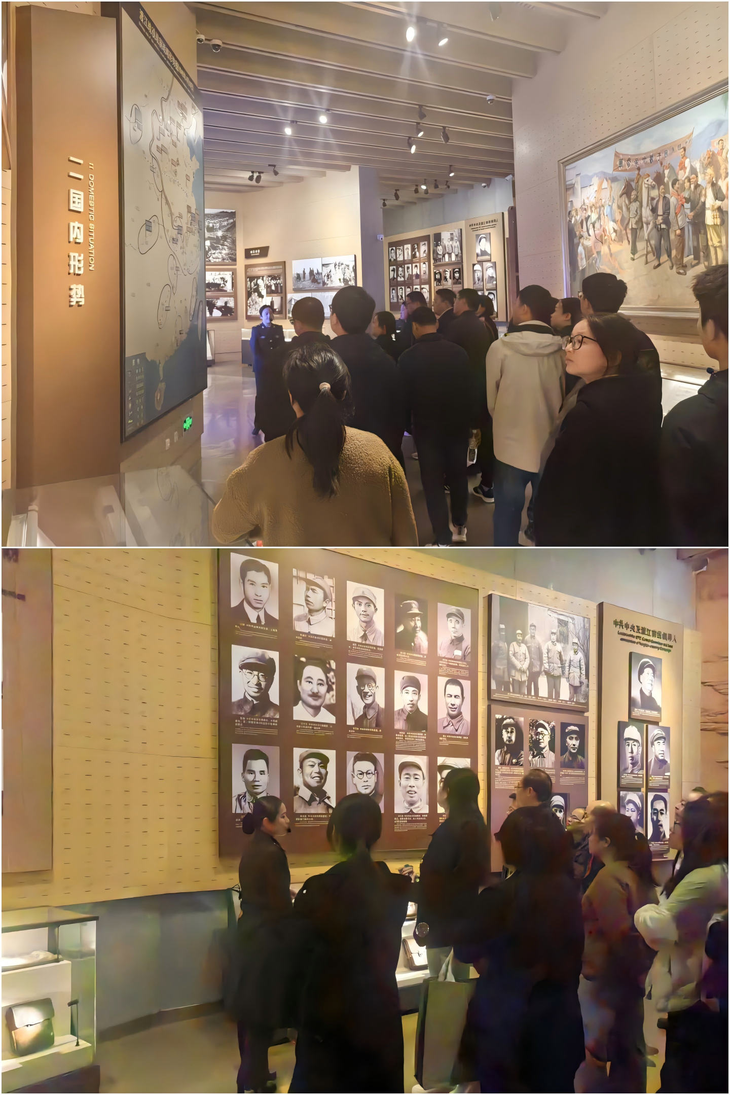 随后,全体党团员在志愿讲解员的引领下,依次参观“战前形势”“战役准备”“突破江防”“战役胜利”“人民支前”“英烈业绩”等展厅。通过听取讲解、瞻仰实物文献,全体党团员沉浸式感受到革命先烈们为了国家独立和民族解放所付出的巨大牺牲和不懈奋斗的坚定信念,体悟到渡江战役这场军民团结一心的伟大胜利、这段风雨如磐的革命岁月和永垂不朽的渡江精神。