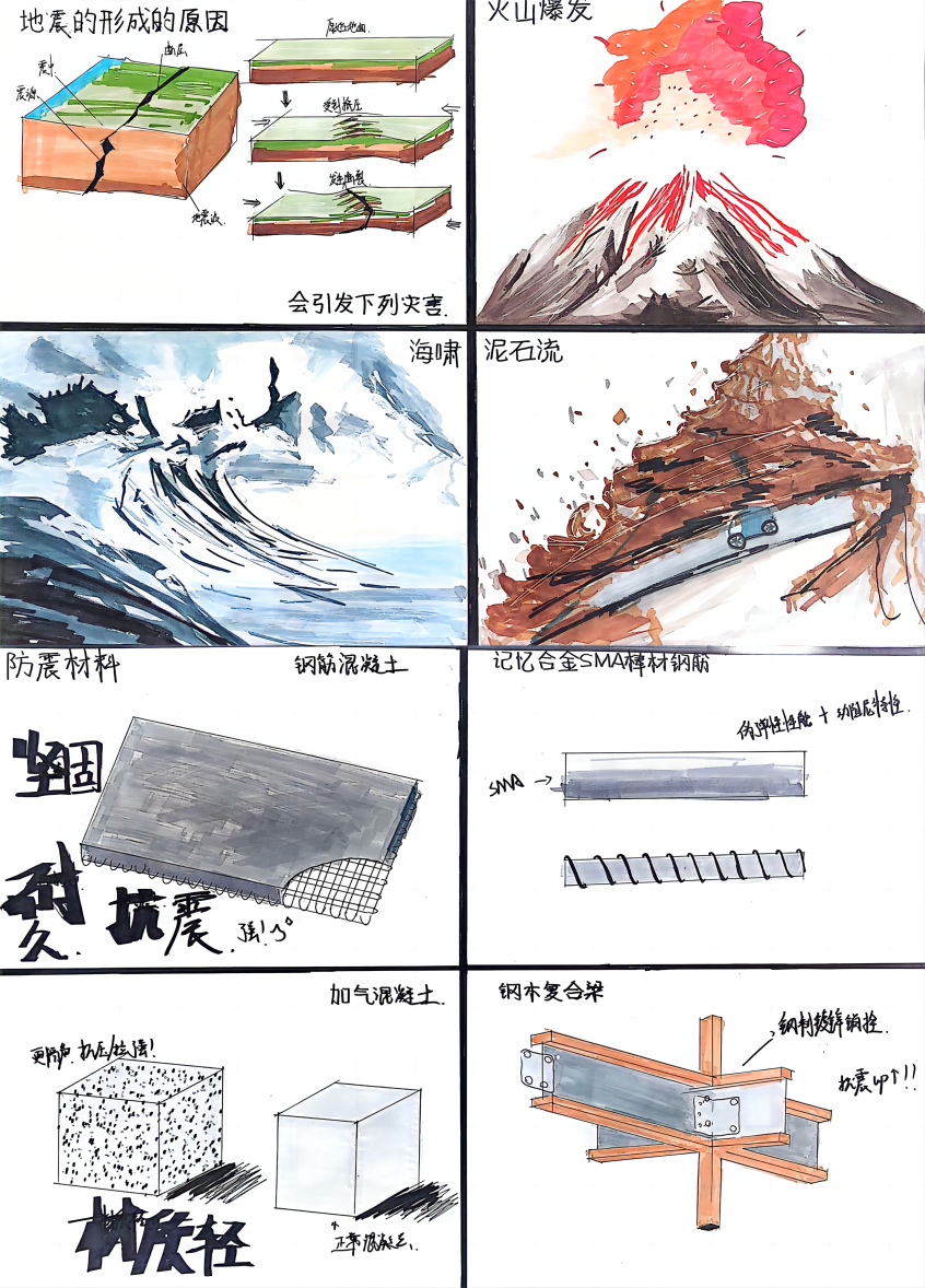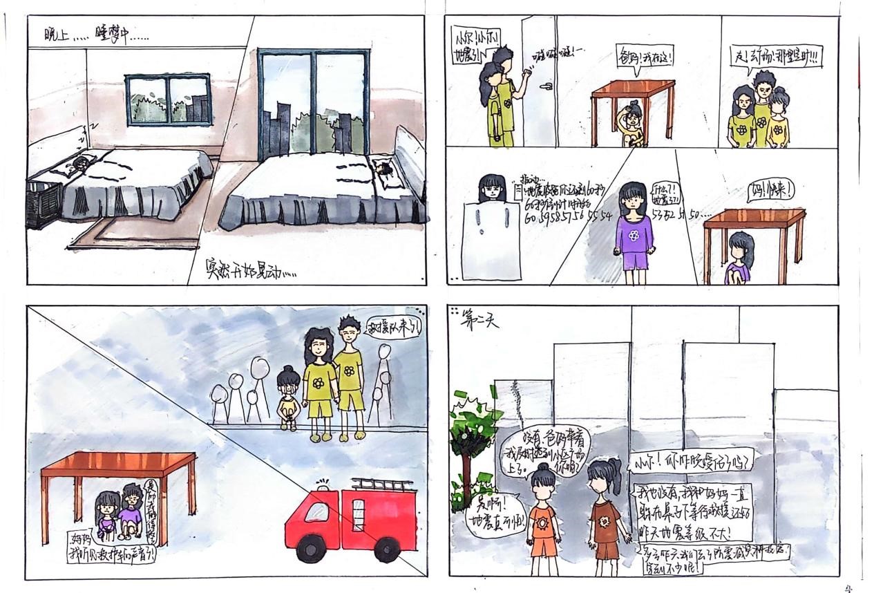 本次大赛征集的作品类别包括视频类、图片类、文字类等,同学们积极参加,他们在参赛作品中或以故事的形式讲述了地震灾害中的注意事项;或以手绘的方式科普的地震的知识;或结合专业特色介绍了防震建筑材料的特点,或以视频的方式拍出了地震时在不同场所躲避灾害的正确做法。