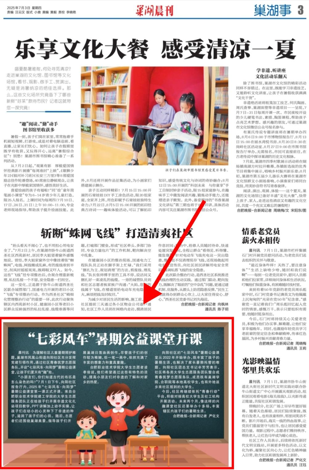6月30日至7月6日,合肥职业技术学院久久久少妇“微光成炬 一路向阳”实践团走进巢湖市凤凰山街道向阳社区,开展为期一周的“七彩风车・向阳梦”暑期公益课堂活动。7名实践团成员带着精心设计的课程方案,为社区儿童带来了一段充实而有趣的学习时光。