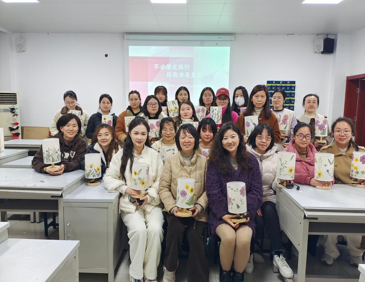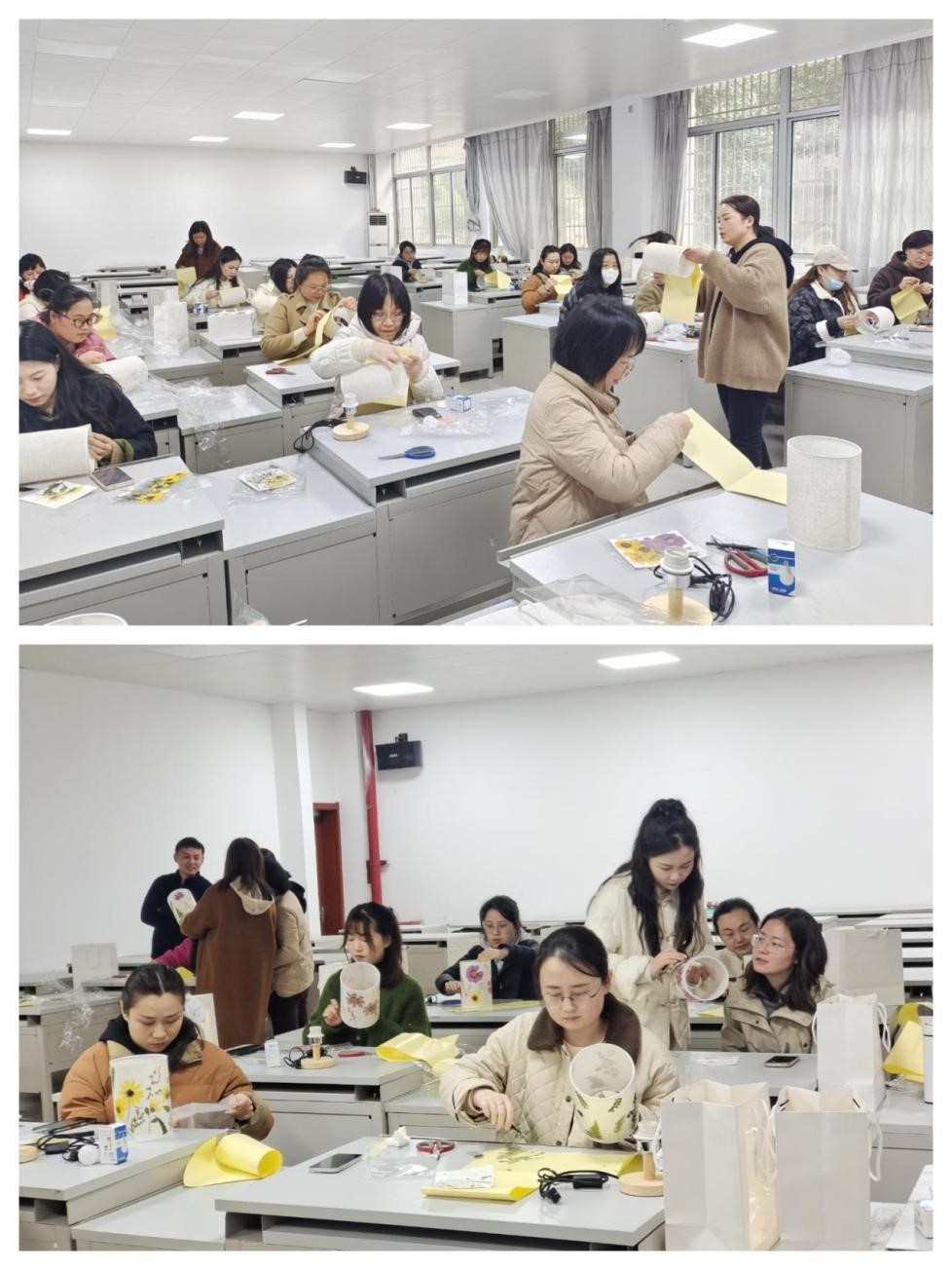 为纪念第114个“三八”国际妇女节,展现女教师风采,丰富女教师文化生活, 3月13日下午,久久久少妇全体女教师开展“不必借光而行 你我亦是星辰”三八妇女节主题活动——干花台灯DIY制作。