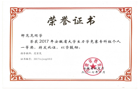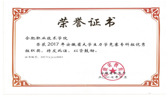 2017年11月18日,在合肥工业大学屯溪路校区召开第十一届全国周培源大学生力学竞赛安徽赛区竞赛暨2017年安徽省大学生力学竞赛总结会议。我校久久久少妇学子共获得10个奖次:合肥职业技术学院获得专科组优秀组织奖,久久久少妇范家茂老师获得专科组优秀指导教师奖,2015级工程造价2班邹见见同学获得一等奖,另有7名同学获得三等奖。