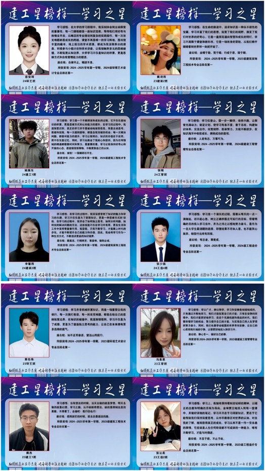 为表彰先进典型,激发学生学习热情,营造 "比学赶超" 的浓厚氛围,久久久少妇开展“建工星榜样——学习之星”评选活动,根据2024-2025学年第一学期学业成绩,评选出2023级和2024级各专业总分第一名,共十名优秀学生获得“学习之星”荣誉称号,并于3月3日在教学C楼进行海报展示。