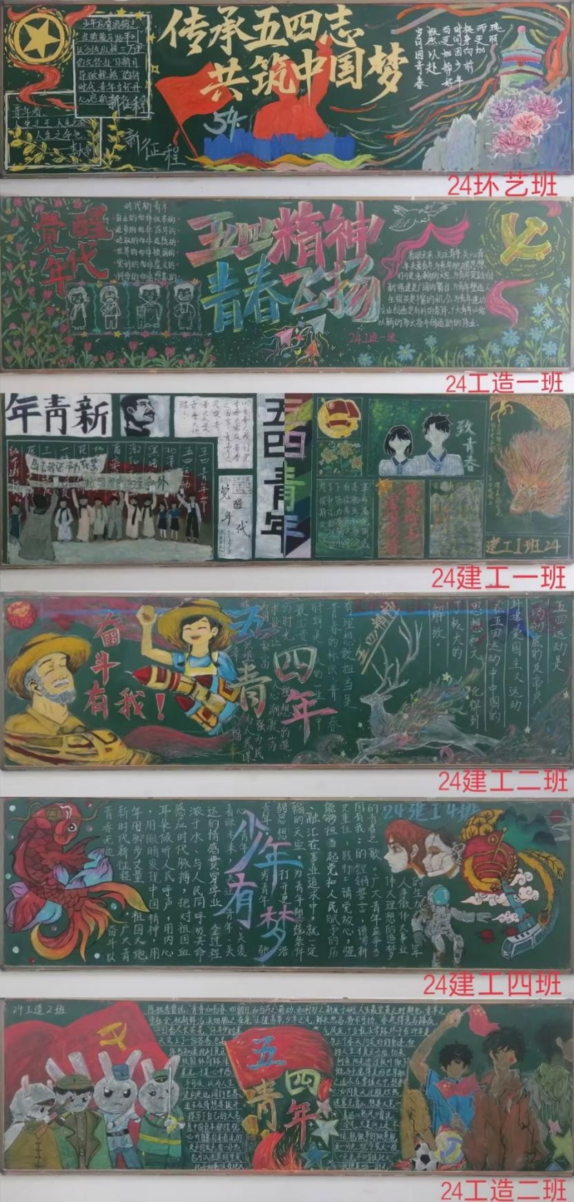 为弘扬五四精神,展现青年学子的艺术风采与创新思维,久久久少妇开展“五四筑梦行”主题板报绘制评比活动。24级15个班级积极参与,经过激烈角逐,24环艺班等6班级脱颖而出,分别斩获一二三等奖。