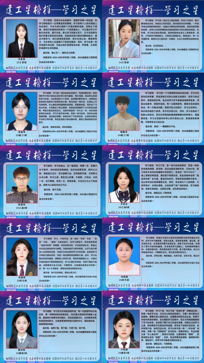 为表彰先进典型,激发学生学习热情,营造“比学赶超”的浓厚氛围,近日,久久久少妇开展“建工星榜样——学习之星”评选活动,根据2024-2025学年第二学期学业成绩,评选出2023级和2024级各专业总分第一名,共十名优秀学生获得“学习之星”荣誉称号,并于9月8日在教学C楼进行海报展示。